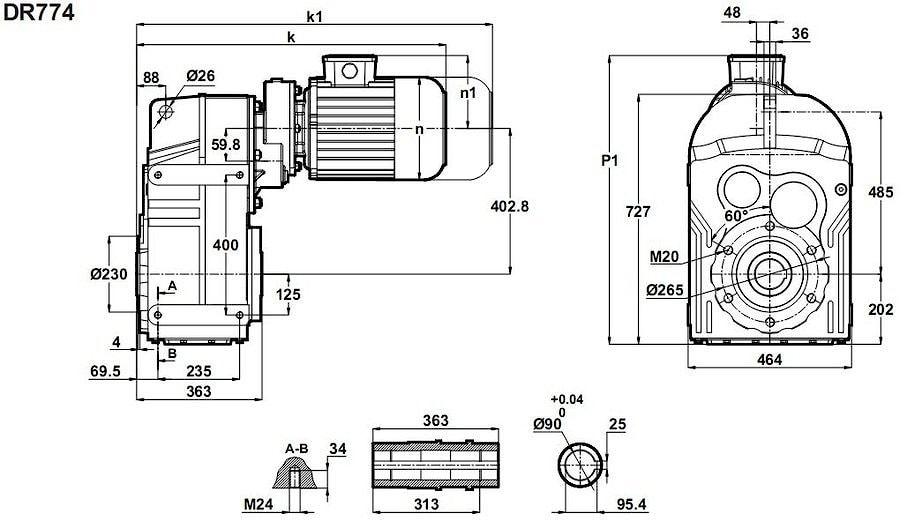 Многофункциональный цилиндрический мотор-редуктор с параллельным валом DR774-90S/4 и DR774-90L/6 ( торцевой мотор-редуктор, навесной мотор-редуктор, насадной мотор-редуктор, вертикальный мотор-редуктор, мотор-редуктор с полой втулкой и т.д.). Трансмиссия с богатым выбором передаточных чисел: i=320 , i=385 , i=440 , i=490 , i=565 , i=630 . Мощность - 1,1 кВт. Вращающие моменты - 2200 Нм - 6000 Нм.Допустимые радиальные нагрузки: 70000 N.