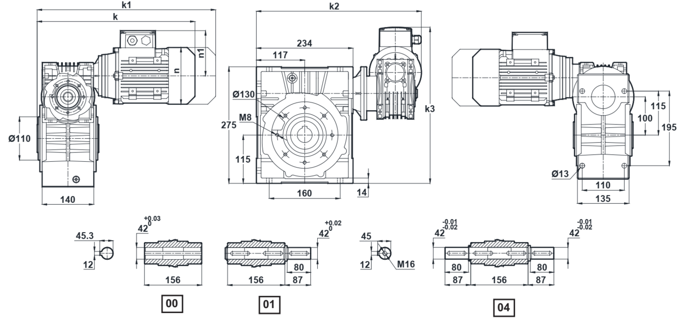 В редукторе червячные пары ступеней компактно расположены в корпусах, дополненных поперечными ребрами жесткости. Помимо функций укрепления литьевых форм (корпусов ступеней) эти ребра ещё выполняют функцию воздух отводов, улучшающих систему тепло отведения привода. Червячные ступени находятся в жёсткой сценке между собой и энергетической установкой (электродвигателем). Помимо прочего корпусные детали редуктора имеют сливные, мерные и заливные горловины, служащие для своевременного контроля и замены трансмиссионной смазки.