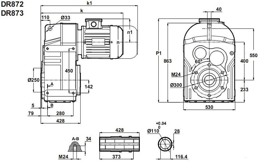 Мотор редуктор DR872-250M/4 DR873-250M/4 - цилиндрический многоступенчатый с параллельными осями, эксплуатируется совместно с двигетелем (асинхронный, синхронный) мощностью - 55 KWВращательный момент: 2000 Nm ... 12000 Nm