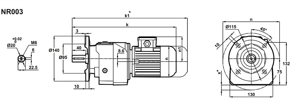 Соосный цилиндрический редуктор MR003 и NR003 Номинальная мощность - 0,18 кВт Выходные обороты: 20 об/мин ... 100 об/мин