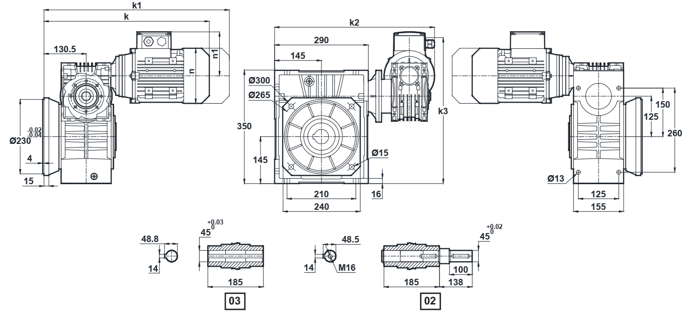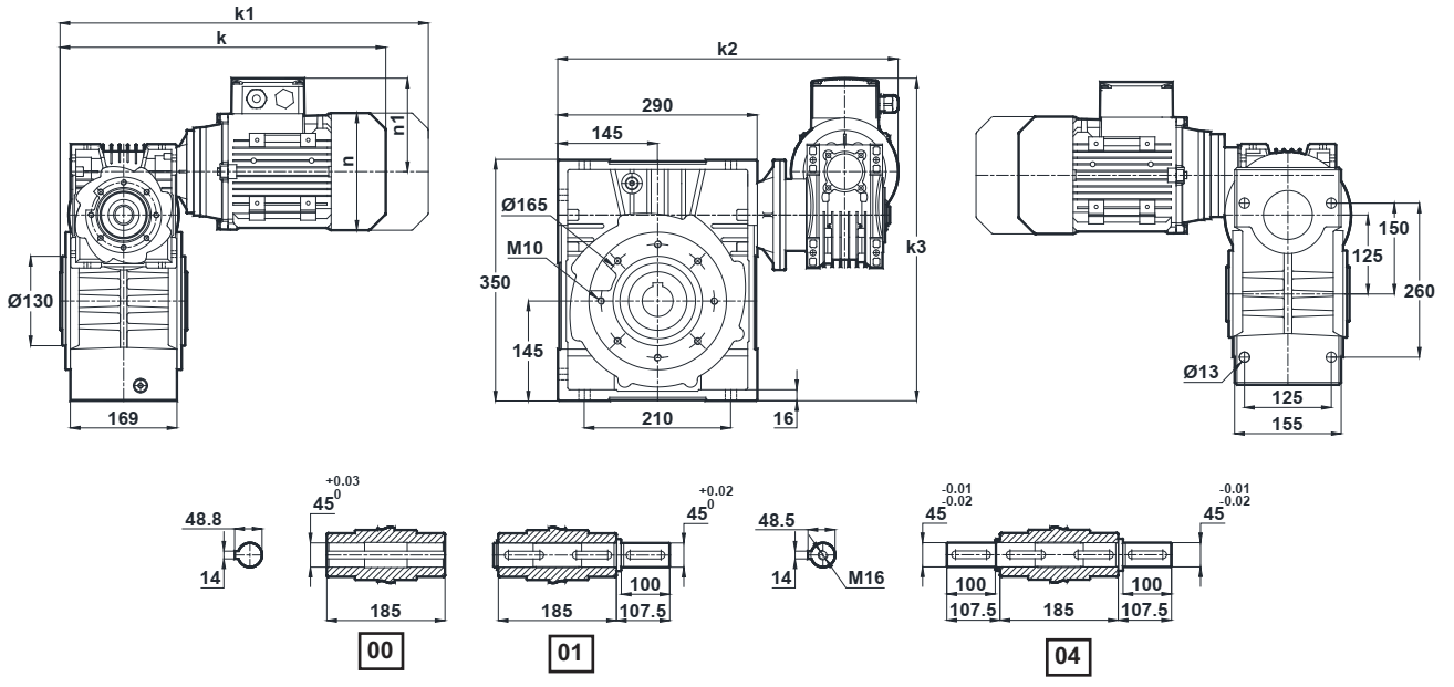 В дополнение мотор-редуктор предлагается с различными монтажно-присоединительными элементами: возможно изготовление специальных диаметров полых валов, одно и двухсторонних полнотелых выходных валов, доступны целый ряд крепежных фланцев с нестандартными размерами, реактивных штанг и прочее (см. дополнения).