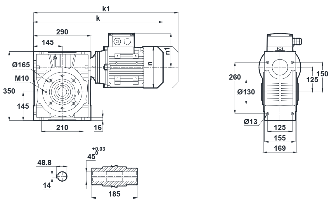 К мотор-редуктору могут быть предложены различные монтажные присоединительные элементы: односторонние и двухсторонние выходные валы, могут изготавливаться специальные диаметры полых валов, фланцев и др. (см дополнения).