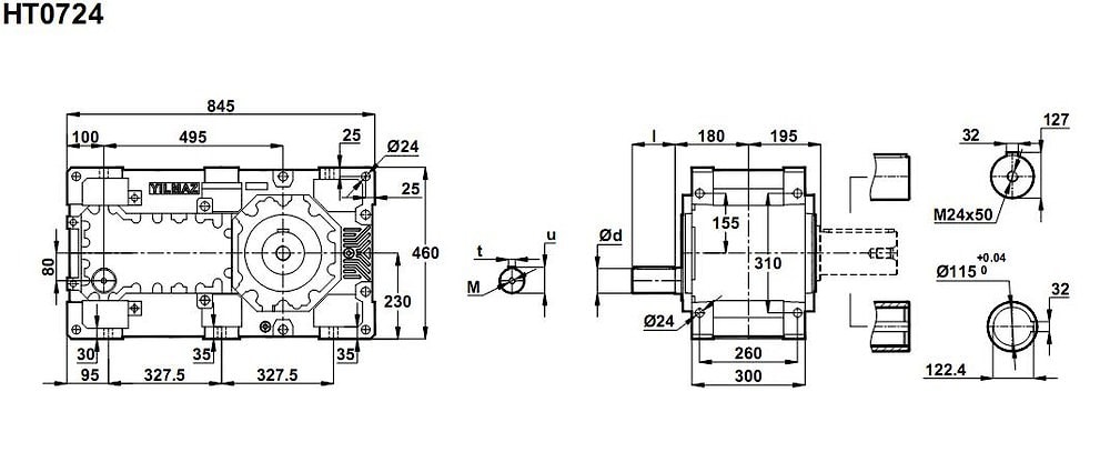 C расчетным номинальным крутящим моментом - 19000 нм выпускается четырех ступенчатый цилиндрический редуктор HT 0724 , модель предлагает высокий диапазон передаточных чисел: i=90 ~ i=310 .Подводимая мощность 9,3 кВт - 33 кВт при входных оборотах 1500 об/мин; подводимая мощность 6,0 кВт - 21 кВт при входных оборотах 1000 об/мин; подводимая мощность 5,0 кВт - 18 кВт при входных оборотах 750 об/мин; подводимая мощность 3,0 кВт - 11 кВт при входных оборотах 500 об/мин; подводимая мощность 2,0 кВт - 7,1 кВт при входных оборотах 300 об/мин.