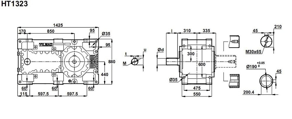 Мощнейшая промышленная трансмиссия HT 1323 - трехступенчатый редуктор с цилиндрическим эвольвентным зацеплением, набор передаточных соотношением на выбор: i=1:25 , i=1: 29 , i=1: 34 , i=1: 37 , i=1: 40 , i=1: 43 , i=1: 47 , i=1: 55 , i=1: 63 , i=1: 68 , i=1: 73 , i=1: 80 .Подводимая расчётная мощность: 154 кВт ~ 543 кВт при входной скорости 1400 об/мин , 101 кВт ~ 350 кВт при входной скорости 900 об/мин , 85 кВт ~ 292 кВт при входной скорости 750 об/мин , 52 кВт ~ 176 кВт при входной скорости 450 об/мин , 36 кВт ~ 117 кВт при входной скорости 300 об/мин .