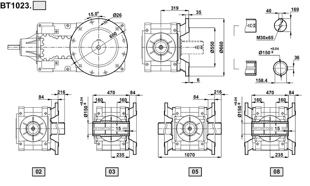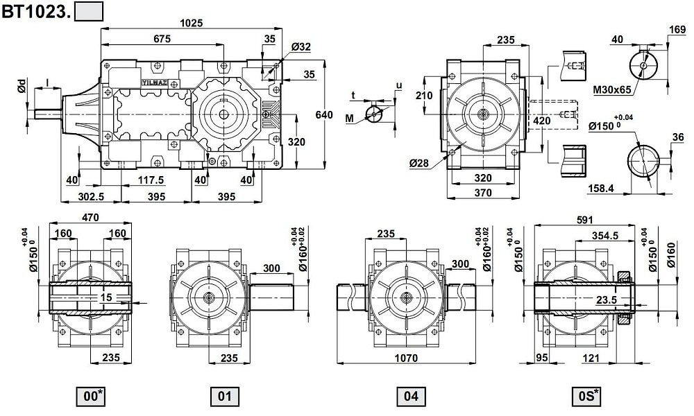 Конический цилиндрический редуктор BT 1023 промышленного типа, номинальное значение передаваемого крутящего момента - 35 000 ньютон/метр. Передаточные числа: i=1:15, i=1:17, i=1:20, i=1:22, i=1:24, i=1:26, i=1:28, i=1:33, i=1:38, i=1:42, i=1:46, i=1:54, i=1:62, i=1:67, i=1:72, i=1:79.Расчетная мощность привода: 57KW - 239KW при угловых скоростях 1500 об/мин, 37KW - 157KW при угловых скоростях 1000 об/мин, 31KW - 132KW при угловых скоростях 750 об/мин, 19KW - 81KW при угловых скоростях 500 об/мин, 13KW - 54KW при угловых скоростях 300 об/мин.