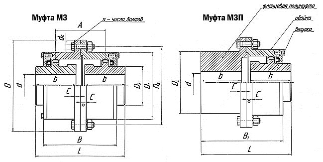 | Тип муфты | D | d | d1 | D1 | D2 | D3 | L | B | B1 | b | c | A | DБ | Мxn | Масса, кг МЗ/МЗП |